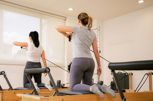 Nuestras clases presenciales son en maquinas llamadas Reformer, una especie de camilla sobre la que se desliza una plataforma de rieles. Su sistema de resortes, agarres, poleas y muelles proporciona una resistencia variable y permite combinar diversos tipos de ejercicios, ajustándola a tus necesidades.